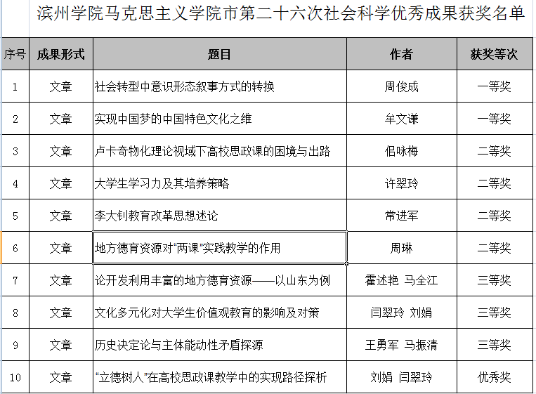 近日,滨州市第二十六次社会科学优秀成果奖评审结果揭晓,公司喜获丰收,10项成果获得滨州市社会科学优秀成果奖,其中一等奖2项,二等奖4项,三等奖3项,优秀奖1项。周俊成教授的文章《社会转型中意识形态叙事方式的转换》和牟文谦副教授的文章《实现中国梦的中国特色文化之维》获得了本次评选的一等奖。