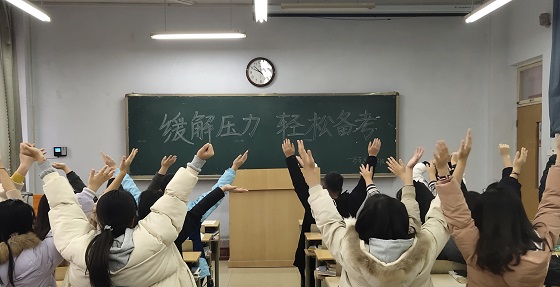 班会伊始,张然向员工提出了有关准考证以及规定携带的文具等问题,让同学们做好充分的考前准备,同时也向同学们传授了一些应试技巧,以做到高效高质量答题。班会期间,张然组织同学们进行了放松训练,同学们通过握拳法、双臂摸肩等放松了身心。最后,张然向员工们分享了历届学姐学长的建议和暖心语录,让同学们得到了极大的鼓励,同时也明确了自己在未来几天的准备方向。