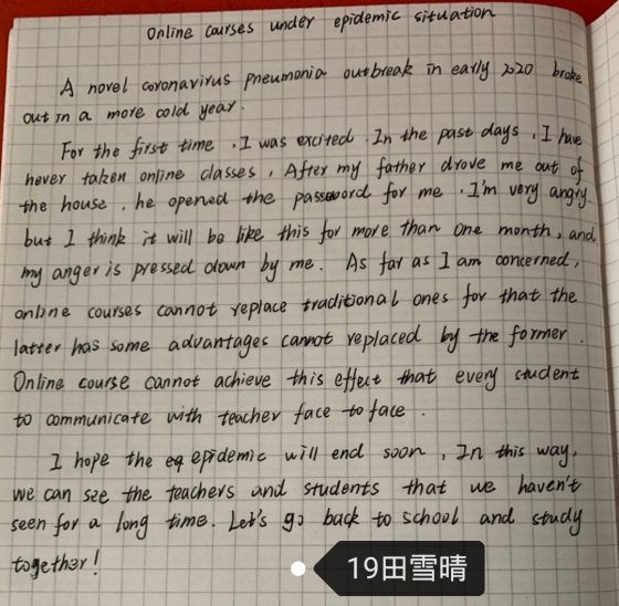 为了进一步了解同学们网络学习情况,激励同学们提高学习效率,保持学习热情。公司于5月7日举办“疫情下的网课”主题英语写作大赛活动,17、18、19级部分员工参加。