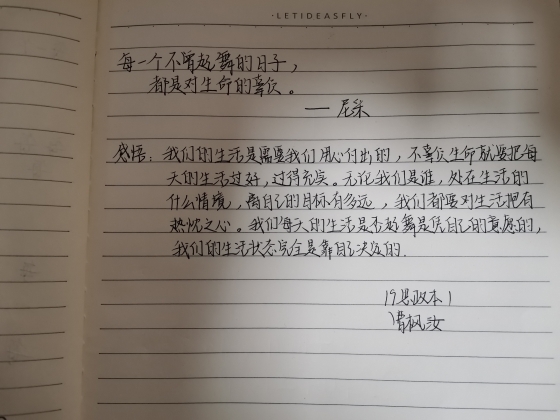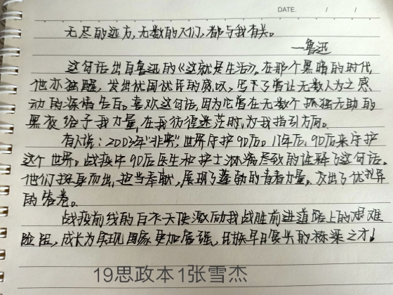 活动前由负责人对活动进行宣传并下达活动通知,积极开展前期组织工作,动员同学们参加此次活动。活动中同学们选择自己喜欢的格言,写出自己的感悟,并拍照记录线下撰写的作品。曹枫汝从尼采的“每一个不曾起舞的日子,都是对生命的辜负。”中体悟到我们的生活是需要我们用心付出的。张雪杰从鲁迅的“无尽的远方,无数的人们,都与我有关。”中联想到战疫前线的白衣天使的无私奉献。此次活动圆满结束。