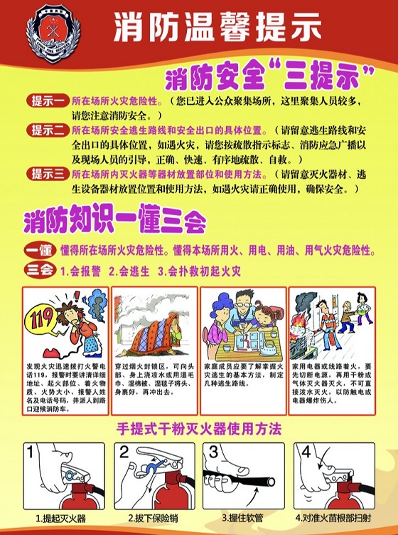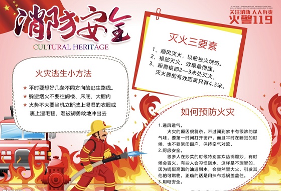 在我们日常生活里,天天都离不开火,使用和管理得好,就对人有益、有利,使用管理不好,会发生火灾,影响人们的生活,给国家和人民生命财产造成重大损失,所以搞好消防安全教育是非常重要的。必须掌握火燃的根源,也就是燃烧的三要素:可燃物、助燃物、火源。要注意的是使用的明火、吸烟,玩火,燃放烟花爆竹、生炉子、易燃易爆物品,各种电器使用等,所以,了解消防知识,学会怎样使用灭火剂和灭火器,及时报警和自救等尤为重要。