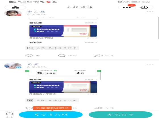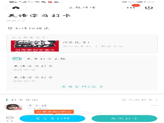 在活动中,负责人利用QQ“小小签到”小程序发布签到任务。员工下载“英语流利说”APP并进行注册,员工每天将自己的学习时长进行截图并用于打卡签到,大部分同学学习时长每日都在30分钟以上,主要以单词及短文跟读为主。在学习过程中,学习部通过举办答题测评检验员工英语学习成果。本次活动贯穿整个暑假期间,一百余人参加,在同学们的积极配合下有序进行。
