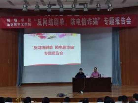 活动伊始,靳雪银介绍了开展本次活动的目的和意义。张晓芳列举了滨州市近日发生的多起电信诈骗案,指出刷单本身就是违法行为,警示同学们切不可相信任何刷单行为。此外还带领同学们分析了电信诈骗的主要类型和作案手法,以及如何逐步识破电信诈骗的兼职刷单骗术。活动最后,靳雪银对本次报告会做出总结,提出了刷单可能带来的三项罪名,提倡同学们要把主要精力放在学习上,表达了对同学们的关切。