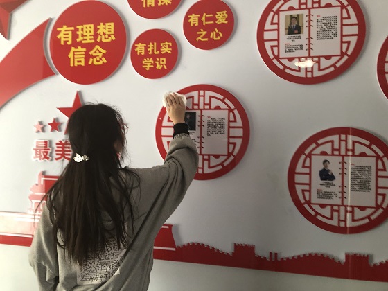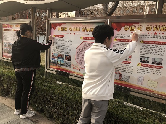 一组同学打扫2号教学楼的宣传栏。同学们用抹布轻轻擦拭每一张作品,用新做好的宣传单来装点缺失的墙面,使我们的走廊环境焕然一新;