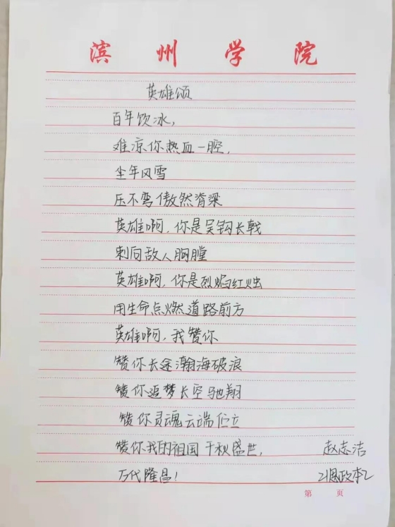 活动前期,负责人下达活动通知并积极开展宣传工作,同学们踊跃报名、积极参加并在规定时间内完成作品并上交。在负责人的组织下,11月6日,同学们到达教室顺利开展了“铭记历史,展望未来”诗歌评比活动。参赛同学依次上台朗诵并讲解自己创作的诗歌。“如今的美好,是英雄替我们负重前行”“英雄啊,你是吴钩长戟,刺向敌人胸膛”,声情并茂,字字铿锵,充分展现了中华儿女的爱国深情。随后由评委秉持公正公开的原则对每位同学的作品进行打分并表彰。其中,赵志洁同学的《英雄颂》真情流露,令人动容,得到了同学的一致好评。评比结束后,同学们表示会铭记峥嵘历史,珍惜现在幸福生活,勤奋读书,学习科学文化知识,为祖国建设贡献自己的力量。