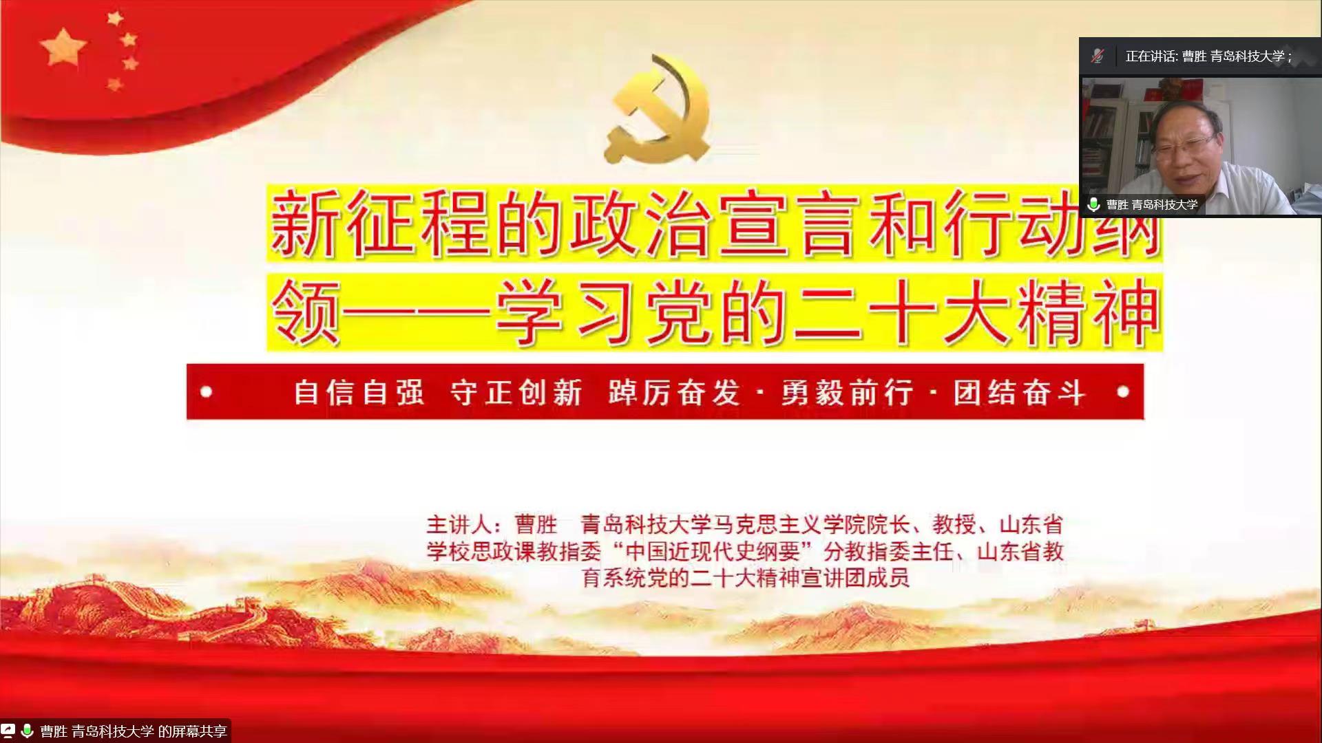 为深入学习贯彻落实中国共产党第二十次全国代表大会精神,及时将党的二十大精神融入思政课教学和科研,11月18日下午,3044am永利集团3044noc党总支理论学习中心组(扩大)组织集中学习,邀请青岛科技大学3044am永利集团3044noc经理曹胜教授作《新征程的政治宣言和行动纲领——学习党的二十大精神》专题报告。